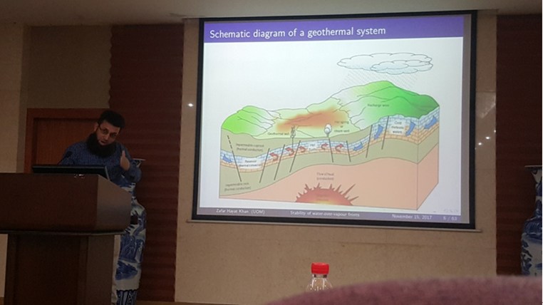 师生做了两次正式报告,分别就纳米流体传热及多孔介质内气液界面稳定性方面的基础性问题,进行了详细汇报,并与我系师生在英文期刊论文撰写、投稿技巧等诸多问题进行了广泛的交流,取得了良好的效果;Khan博士还与后期双方学生交流、科研合作等方面诸多问题,进行了深入和友好的探讨,取得了诸多共识,为我系科研工作的进一步发展,起到了一定的推动作用。