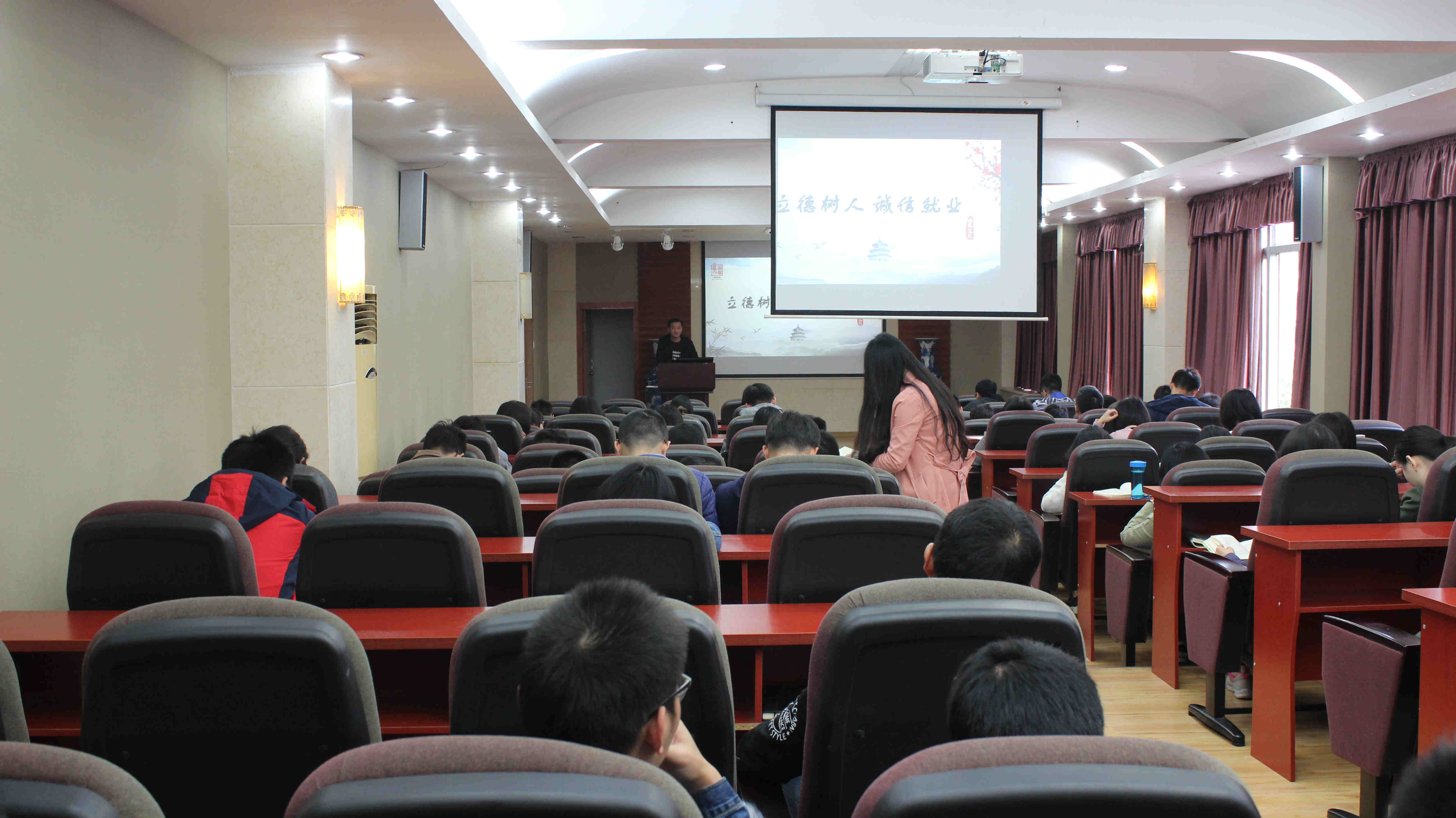 组织了以“诚信教育”为主题的讲座,讲座由学生科科长马丹老师和就业专职岗李国勇老师主讲。讲座就当前相关资助政策和大学生就业诚信问题进行了详细的讲解。