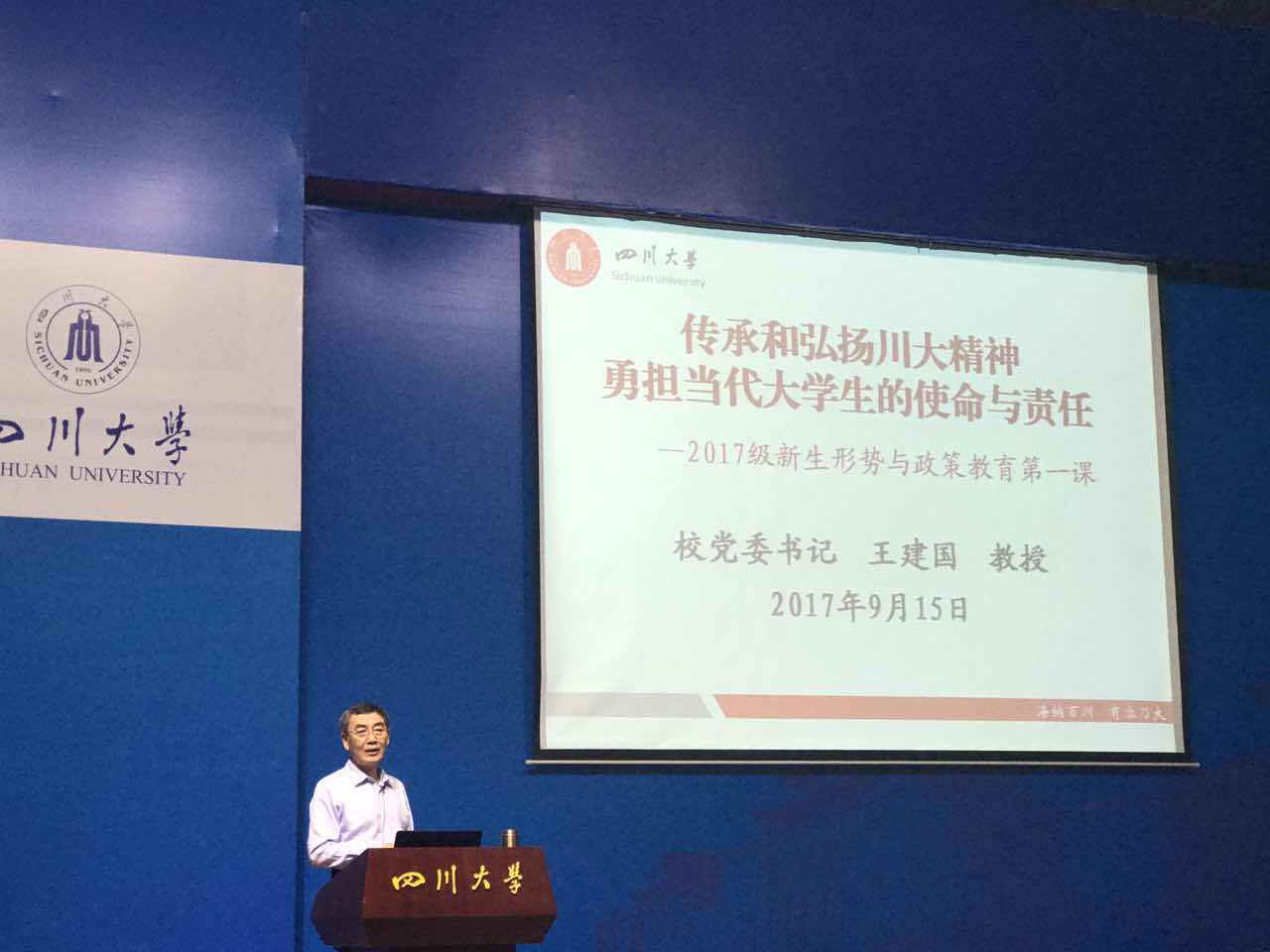 2017年9月15日下午2:30,校党委书记王建国教授为2017级新生讲授的“传承和弘扬川大精神,勇担当代大学生的使命和责任”