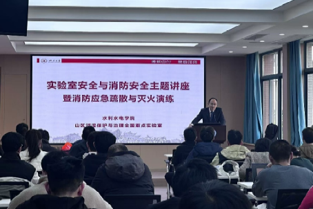 、山区河流保护与治理全国重点实验室于11月29日下午举行了消防安全知识讲座和消防应急演练。讲座由学院工会主席、实验中心主任李洪涛主持。