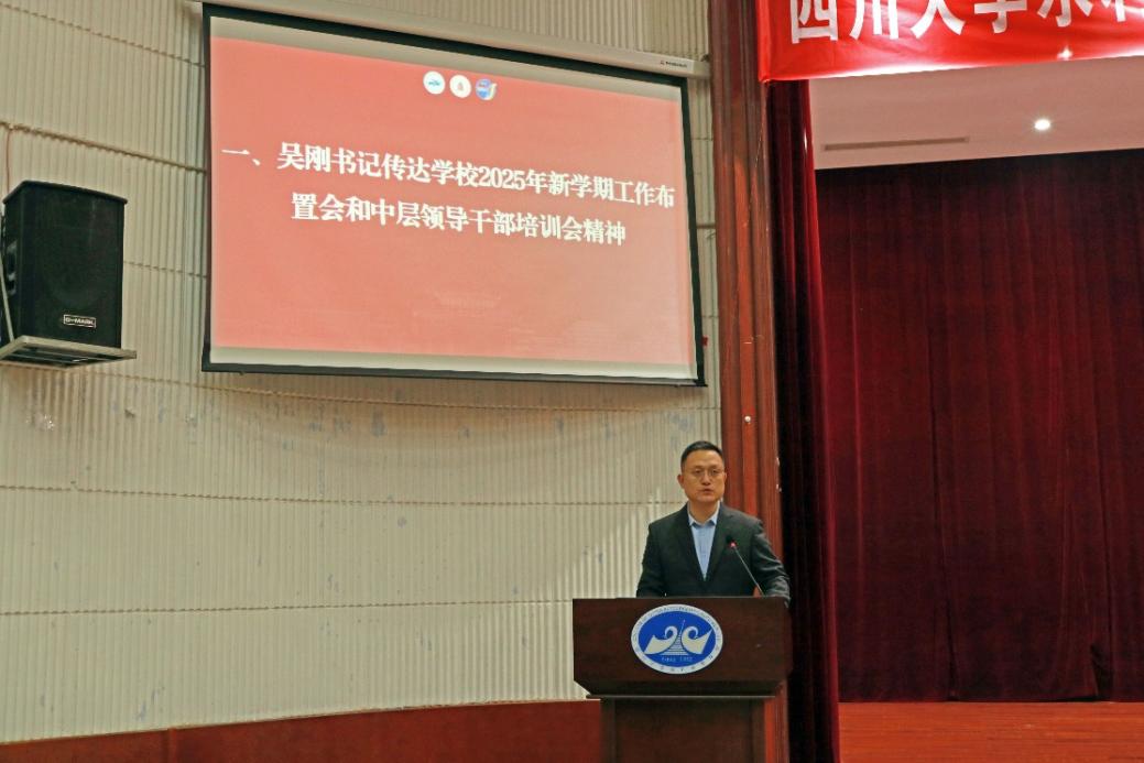 院党委书记吴刚传达学校2025年新学期工作布置会和中层领导干部培训会精神,着重就准确把握形势变化和重点工作进行了解读,强调要认真学习领会和贯彻落实学校会议精神,结合学院实际转化为自身重点工作,以“钉钉子精神”全力推动学校决策部署落地落实,高位推进高质量发展,开创新局面。
