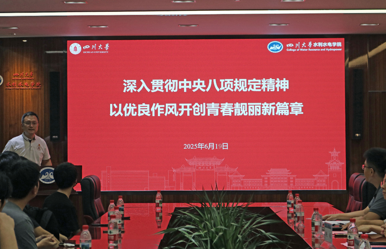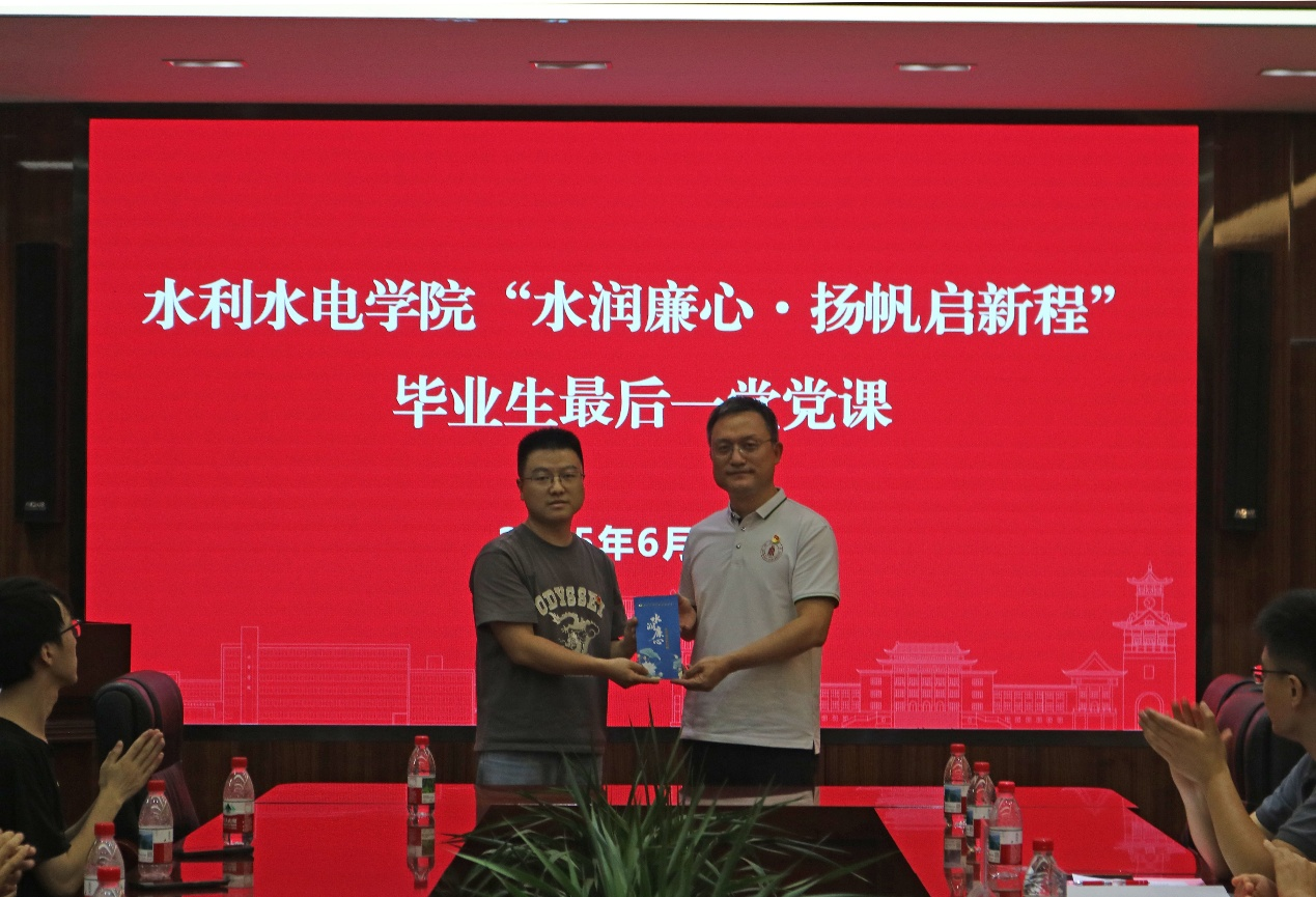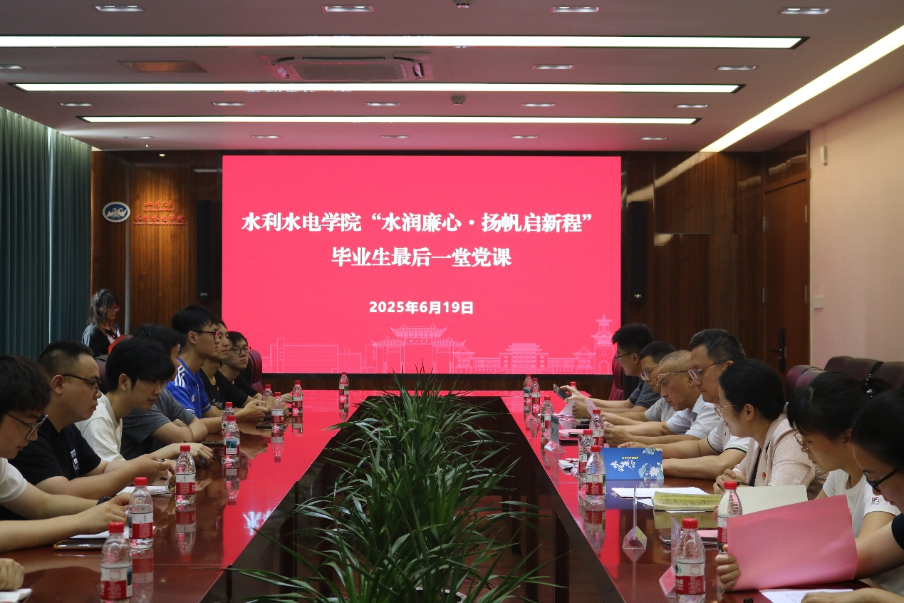于A326举办“水润廉心·扬帆启新程”毕业生最后一堂党课。学院党委书记吴刚,学院关工委教师代表赵毅,山区河流保护与治理全国重点实验室党支部副书记王波,学院学生科科长任成瑶,毕业年级辅导员,毕业年级学生代表参加。学院党委副书记马丹主持。