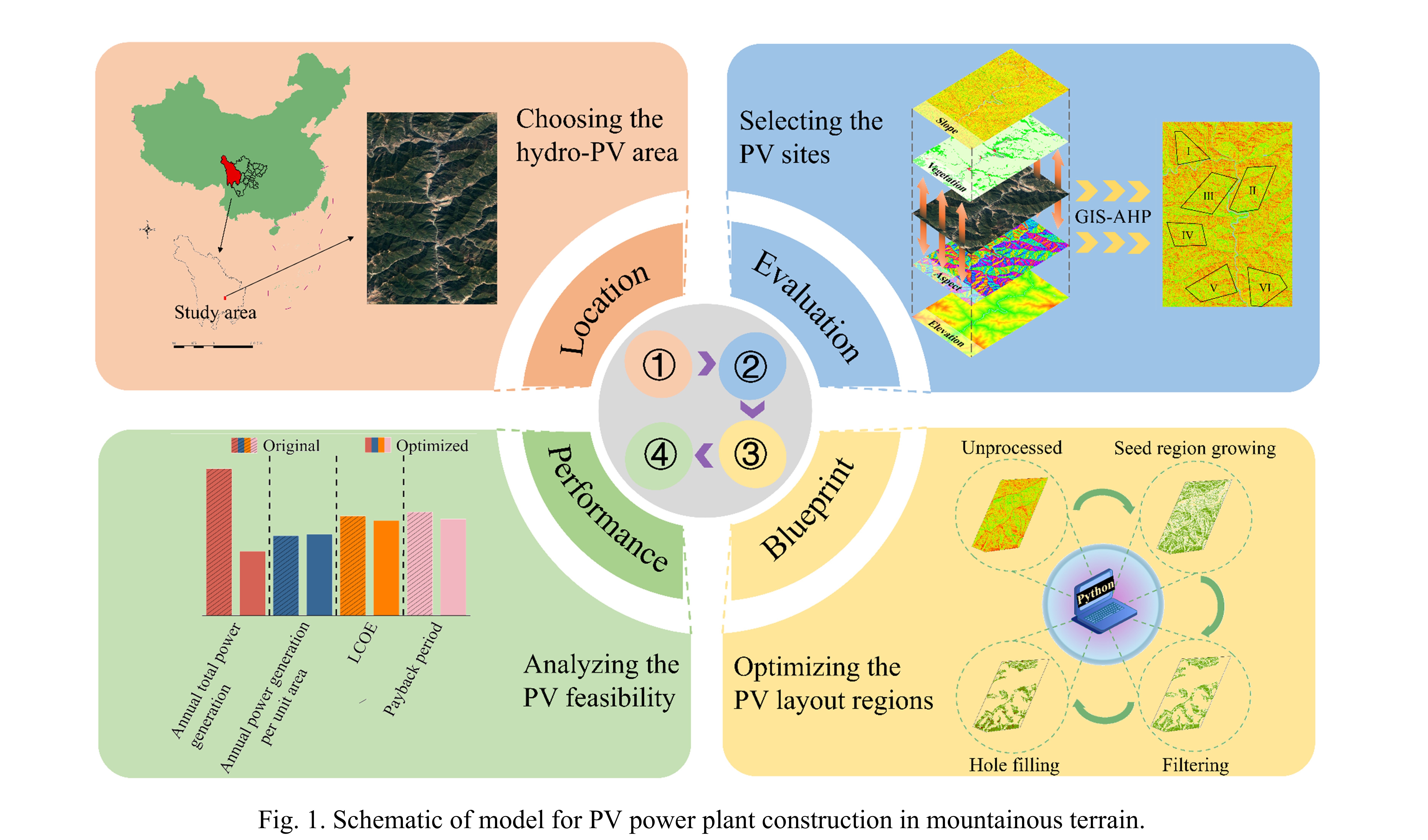 研究团队聚焦山地光伏电站与水光互补系统的协同规划难题,为复杂地形下光伏布局的效率提升与成本优化提供了创新性解决方案。针对水光互补工程,研发了一套整合电站选址、组件布置与性能分析的优化选址模型,为山地光伏电站建设提供了创新性解决路径。该框架通过四个阶段落地实施:研究区域选择、光伏选址适宜性评估、组件布局区域优化以及综合性能分析。论文以两河口水电站水光互补项目为背景,运用GIS-AHP技术,对两河口水电站周边区域开展光伏选址适宜性评估,形成光伏建设适宜性评分;再基于高分值分布初步筛选出候选场址,构建了融合栅格适宜性评分与栅格图像处理的优化方案,用于光伏组件的布局规划,进而通过不同阈值条件的评估确定最优阈值;最终完成了单位面积年发电量、平准化度电成本(LCOE)与投资回收期(PBP)的核算,验证了所提出模型的有效性。论文成果可以有效提升水光互补系统中山地光伏电站的建设效率、显著降低建设成本,为同类工程提供技术参考与实践借鉴。
