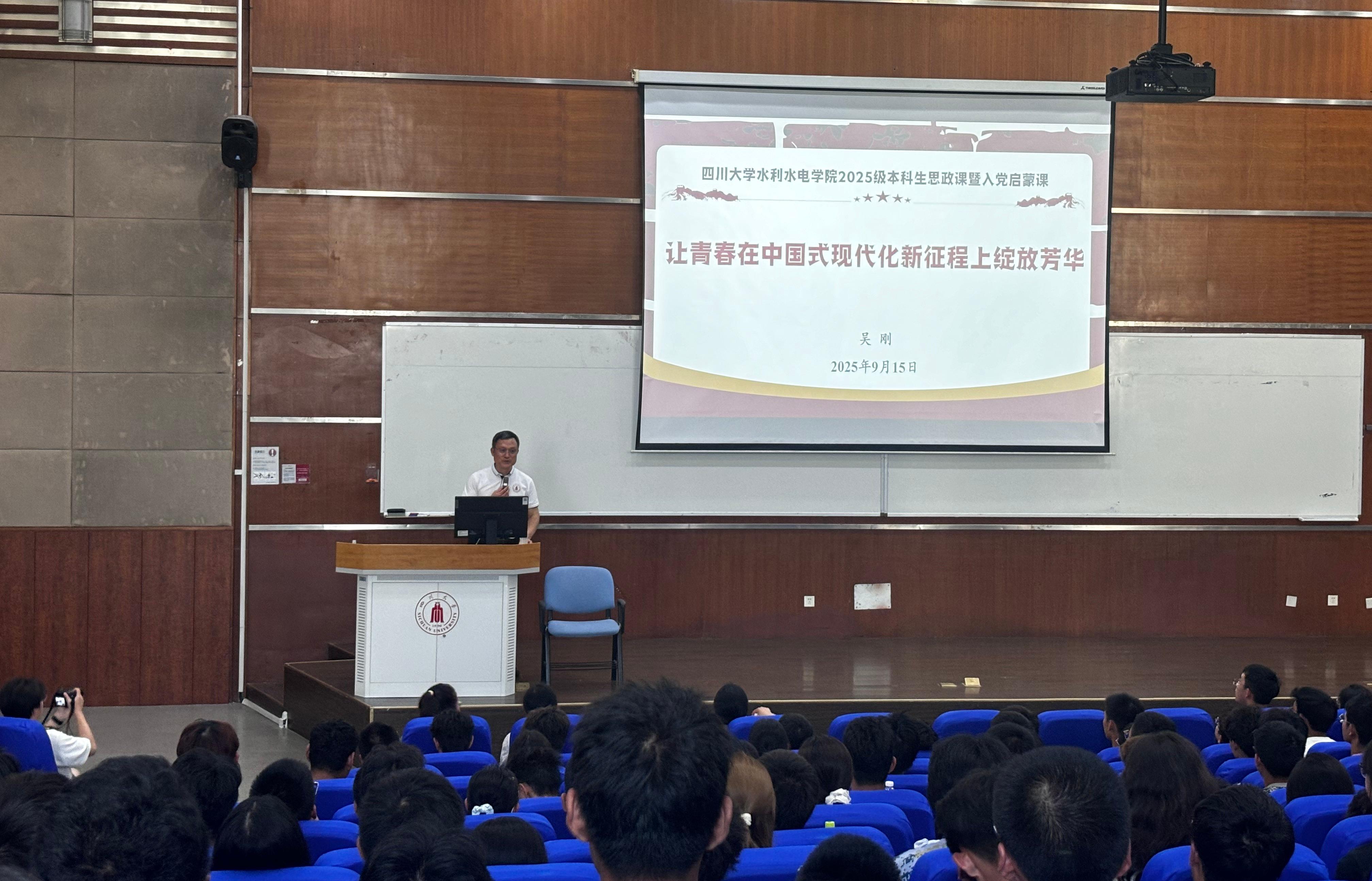 本科新生开学第一课在江安综合楼C407举行。吴刚以“让青春在中国式现代化新征程上绽放芳华”为主题,为全体新生讲授思政课。他从中国共产党的百年奋斗史引入系统阐述中国的复兴之路,鼓励同学们自觉将个人理想融入强国建设、民族复兴伟业;从水电学院的学科实力、光荣传统导入介绍人才培养成效,增强新生对学院的认同感和归属感;从入党流程与要求的详细介绍,引导同学们提高政治觉悟,积极向党组织靠拢。最后,他勉励全体新生珍惜大学时光,科学规划学业与生涯,全面提升综合能力,以奋斗书写灿烂青春。